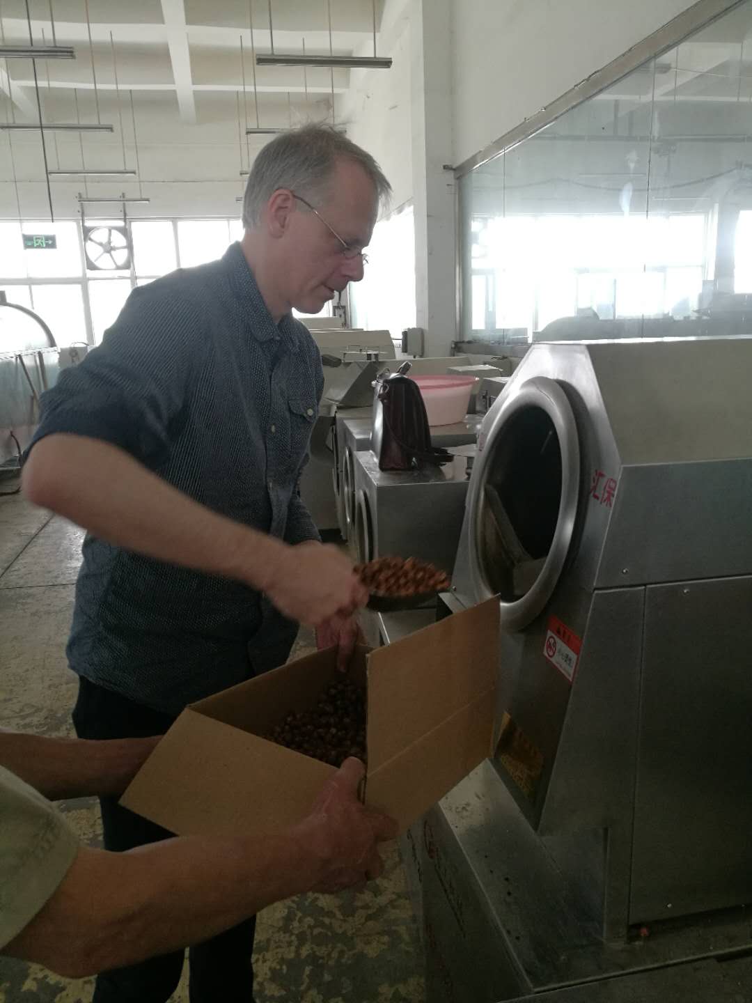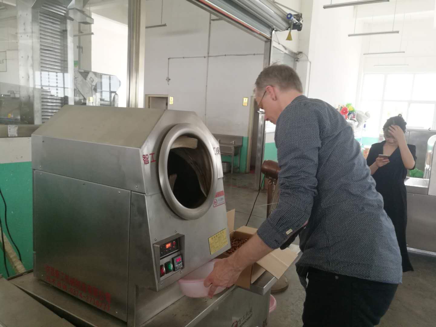 瑞士巧克力生产商来许昌智工试机电磁炒货机炒制榛子。设备操作简单,客户亲自体验并对炒制效果给与高度满评价。